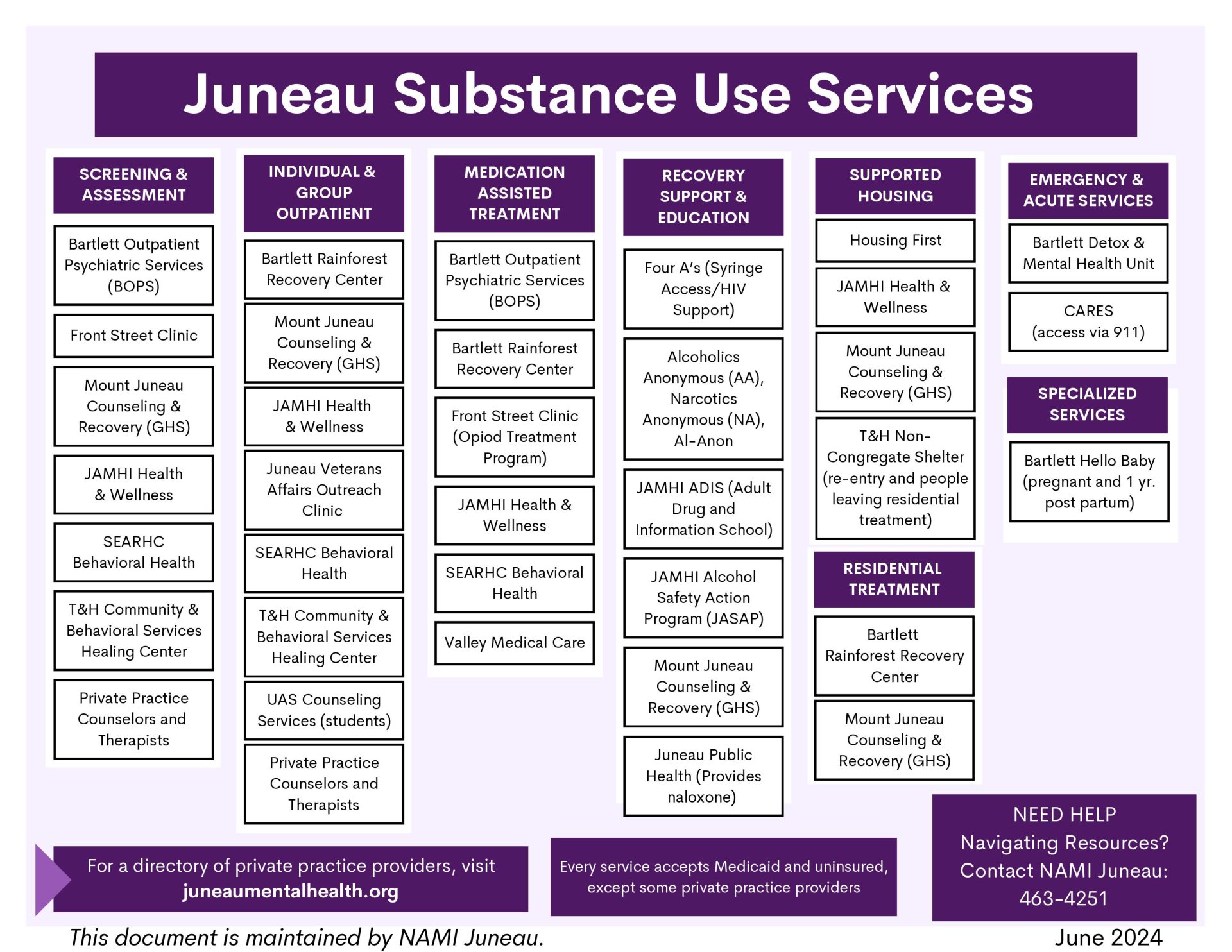 The Substance Use Disorder Services guide lists Juneau’s providers of addiction treatment and services. A copy of the guide may be downloaded by clicking on the image to the left. Additional information for each of the treatment and service providers listed in the guide may be found in the list below.