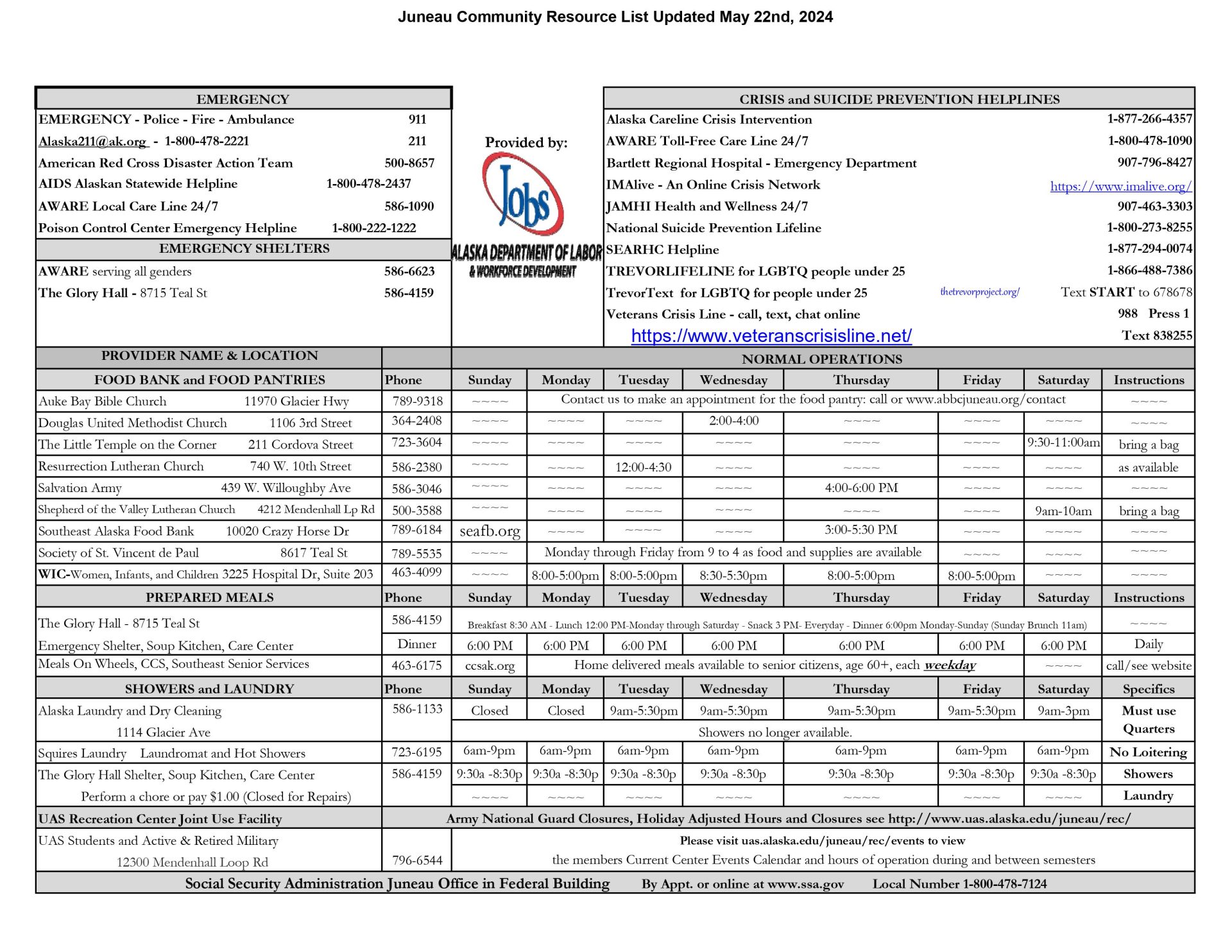 The Juneau Job Center compiles a comprehensive Juneau community resource list. Resources are categorized by service type. The name of the organization and their phone number is listed under the category heading. To download your copy for your purse or pocket, click the resource page on the right.