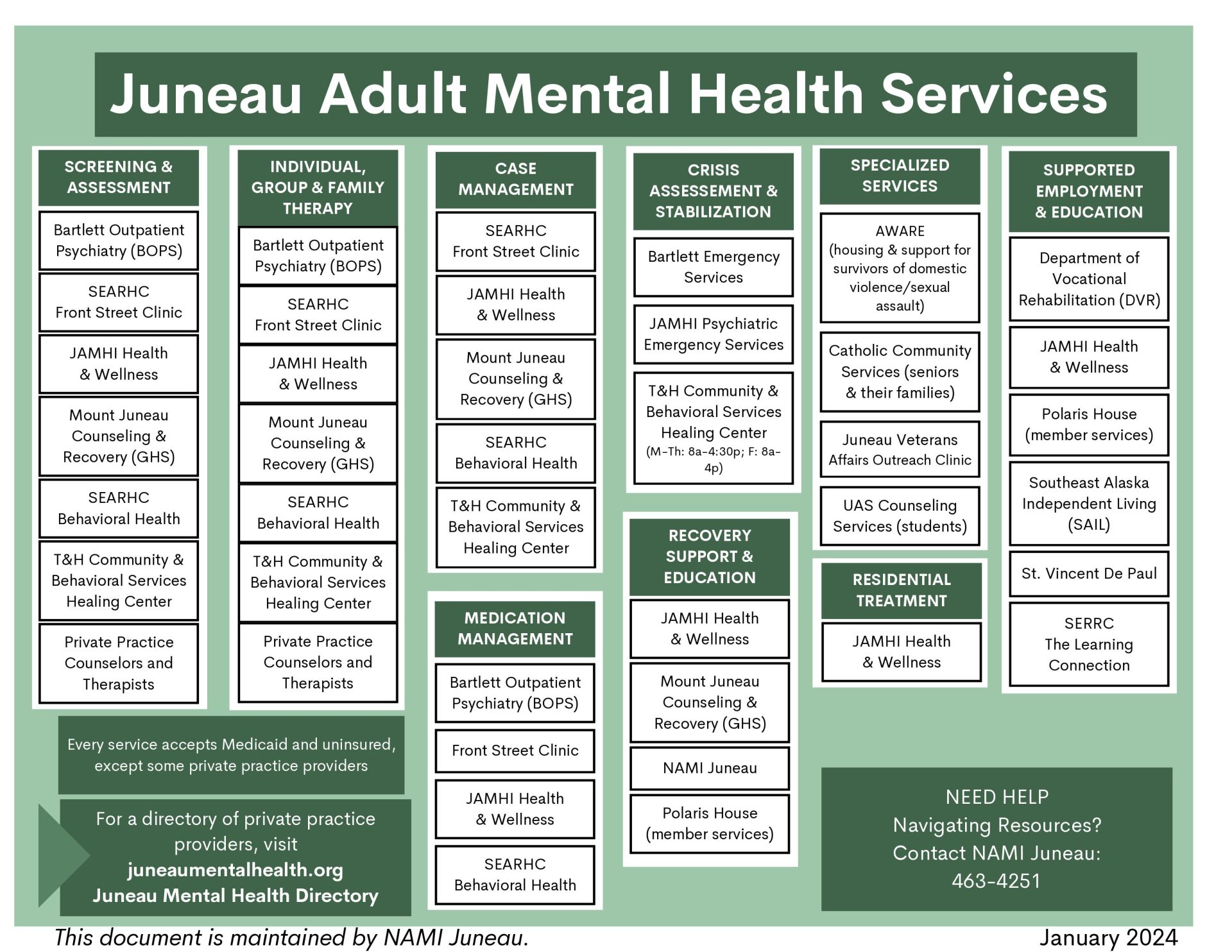 NAMI Juneau is an excellent source for local, statewide, and national mental health resources. In addition to putting out the Juneau Adult Mental Health Services Guide pictured to the left, their website provides many more links to resources. Go to NAMI Juneau’s website by clicking here.