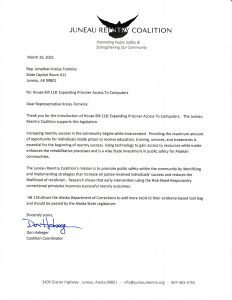 The Thirty-Second Alaska Legislature, now in session, has important bills to help successful reentry. They are Senate Bill 70 and House Bill 118. JREC supports these bills and has written letters supporting their passage.