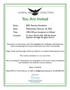 Please join the Juneau Reentry Coalition at 3:00pm on Wednesday, February 18, 2026, as we host a reentry simulation at St. Ann’s Parish Hall in Juneau. This event highlights the challenges that individuals face as they transition from incarceration back into their communities. You can engage as either a participant or a volunteer.